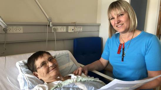 Kirsten Hansen på 66 år fra Roskilde er netop vågnet op efter en hofteoperation på Næstved Sygehus. Her bliver hun mødt af sygeplejerske Karina Jakobsen.